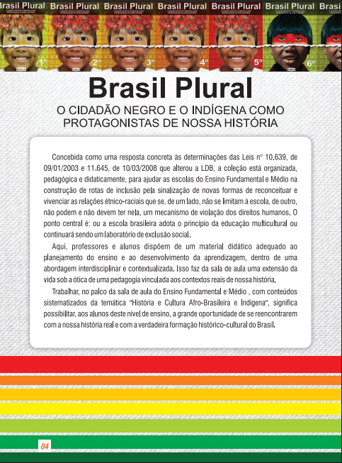 Com foco na Temática de "História e Cultura Afro-Brasileira e Indígena", este Livro de Professores, referenciando à Coleção Brasil Plural , é um Manual de Apoio a professores(as) comprometidos(as) com a igualdade de direitos, com a diversidade humana, com práticas pedagógicas edificantes e com a formação de alunos(as) para uma cidadania responsável e emancipada.